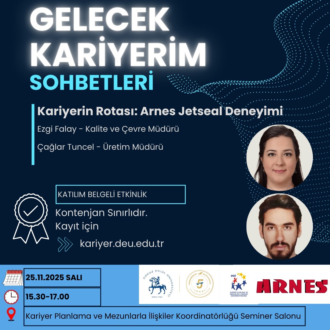 “Gelecek Kariyerim Sohbetleri” programı kapsamında 25 Kasım 2025 Salı günü saat 15.30’da DEÜ Merkez Yerleşkesi Kariyer Planlama ve Mezunlarla İlişkiler Koordinatörlüğü Ofisi Seminer Salonu’nda gerçekleşecek “Kariyerin Rotası: Arnes Jetseal Deneyimi” etkinliğine kayıt için: https://kariyer.deu.edu.tr/tr/arnes-jetseal-ile-gelecek-kariyerim-sohbetleri-kariyerin-rotasi-arnes-jetseal-deneyimi/ adresini tıklayınız.